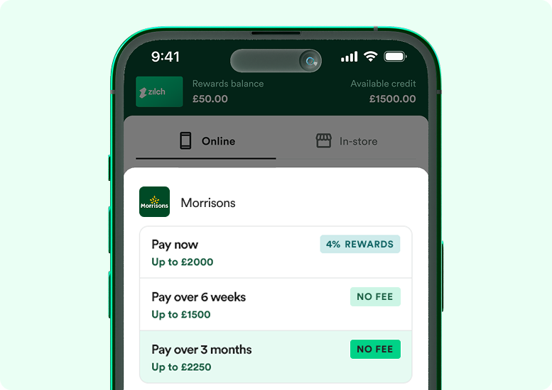 You can Pay over 3 months with no fee at loads of stores in the app. At other retailers, the fee’s up to 5% of your total purchase when you enable your card before checkout – or 6% if you use Zilch Anywhere. You'll never pay interest – just a one-off fee.